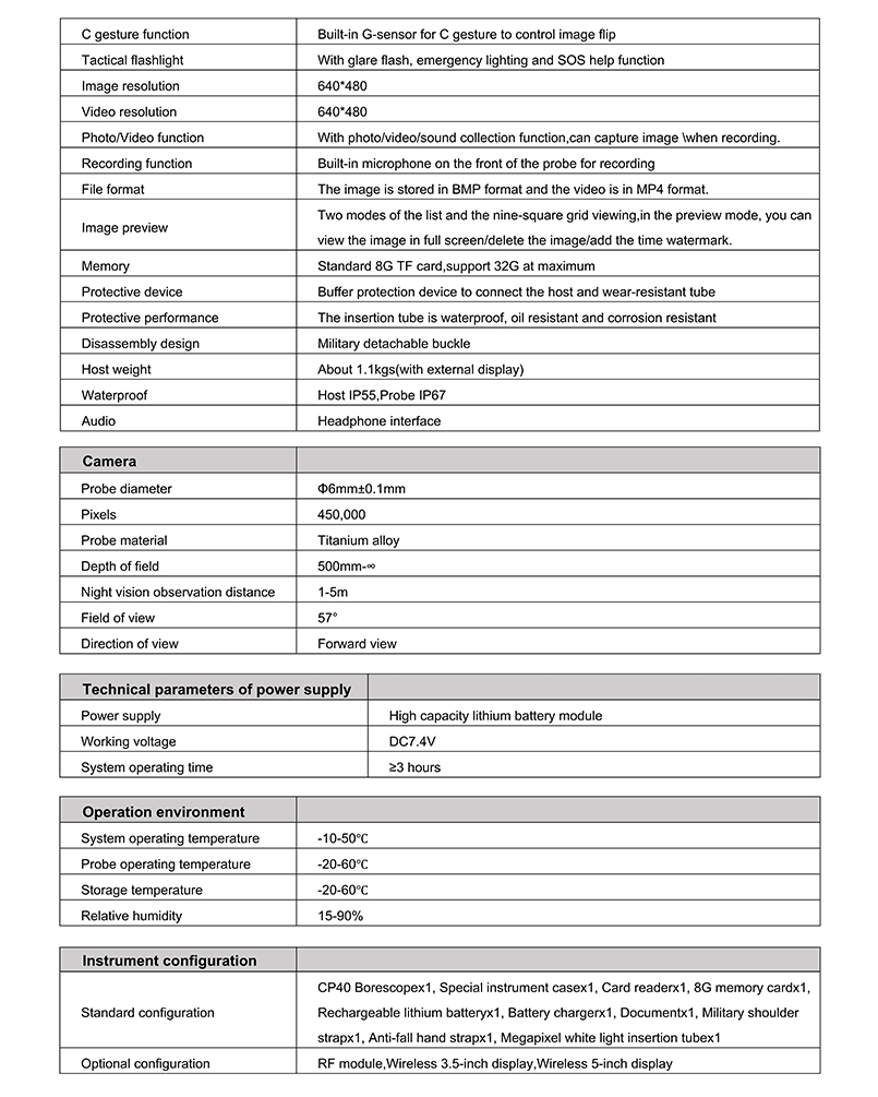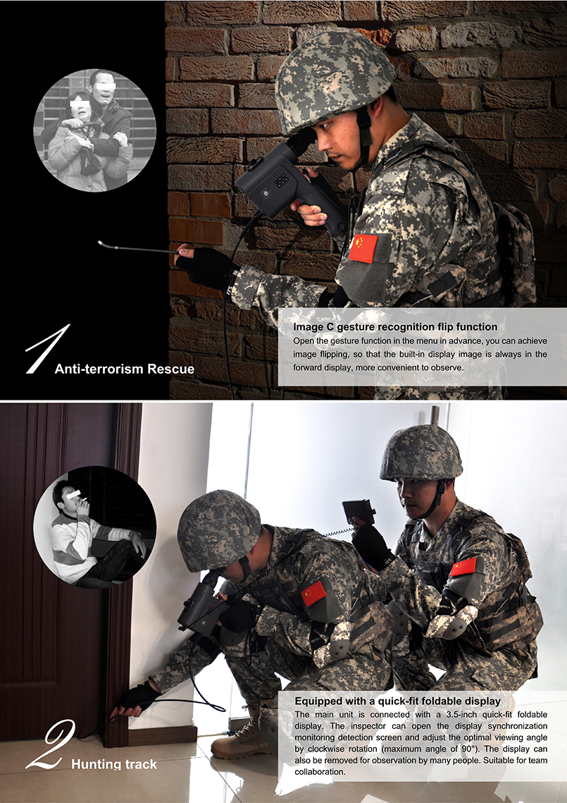 Ifully concealed design、Equipped with a quick-fit foldable display、Photo/video/sound collection function、Image C gesture recognition flip function、Replaceable insertion tube system、Adjustable diopter military OLED display、Flash/lighting/rescue SOS function、Equipped with detachable military shoulder strap